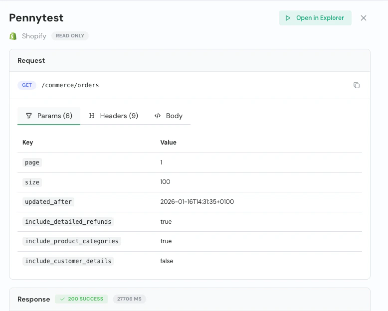 - Transaction replay — Re-run any past transaction via the “Open in Explorer” button. All parameters are pre-filled, including connector-specific query parameters.