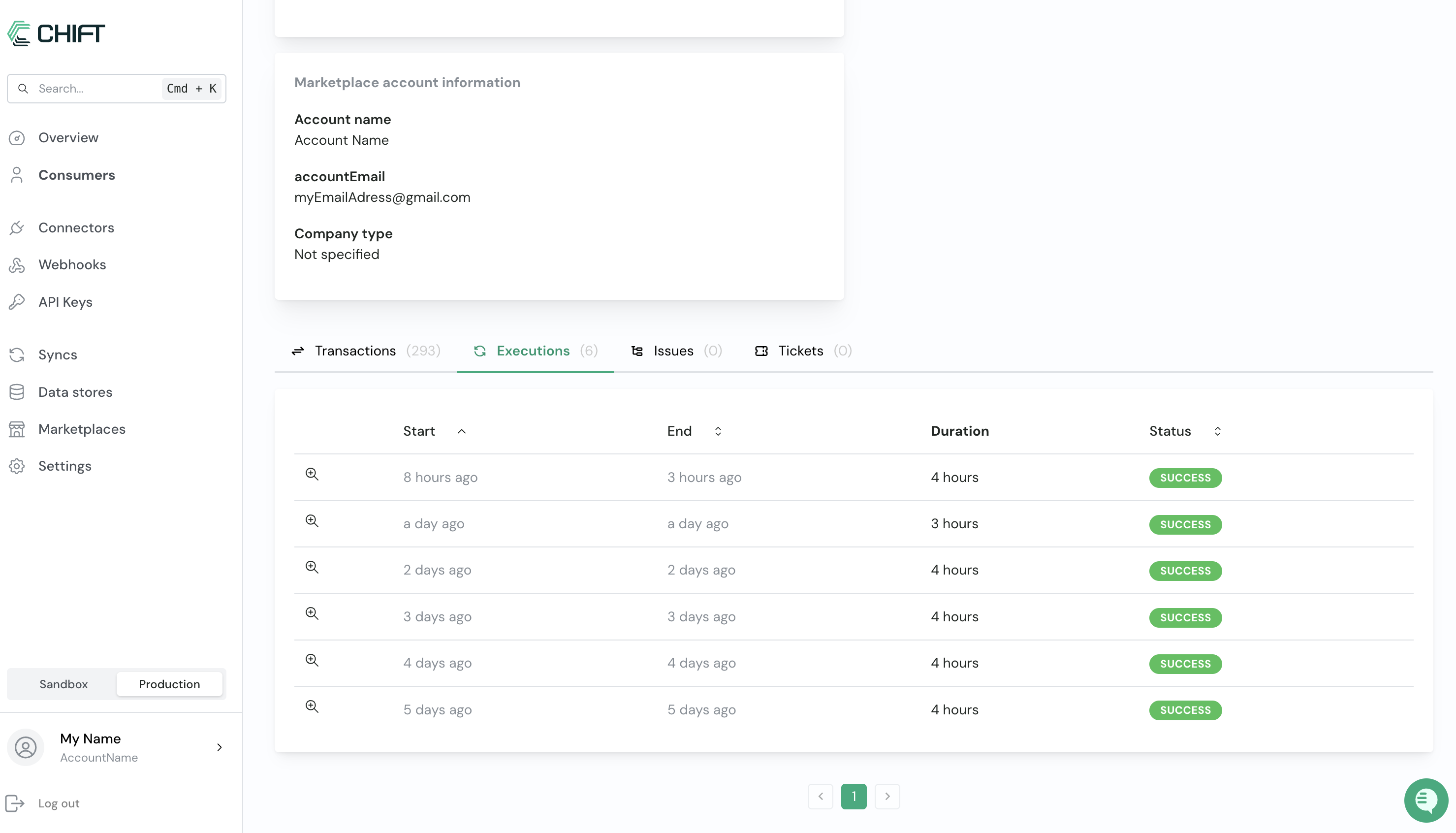 - When you scroll down on the consumer page, you’ll find the transaction table listing all detailed requests related to this consumer. Click on the Executions tab to see all previous synchronization runs.